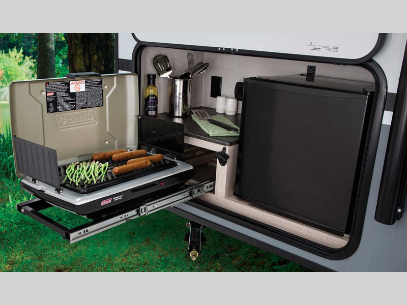 The modern interiors feature Sorrento cabinetry and Shaker cabinet door frames, seamless edge countertops and Congoleum residential flooring which are all complimented by the functional use of each space. Each model also includes a full bath and a functional kitchen making your camping adventures comfortable and easy. Outside, you'll find a power tongue jack, Solid Steps, a hot and cold exterior shower, plus many more conveniences. There is also a 400 watt solar panel with a 30 amp control charger for off-grid capabilities!