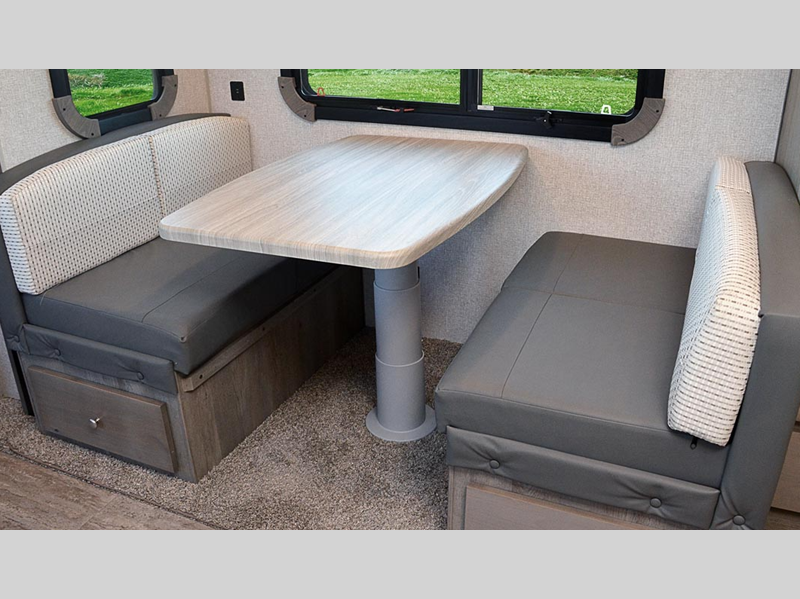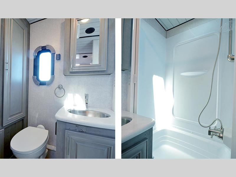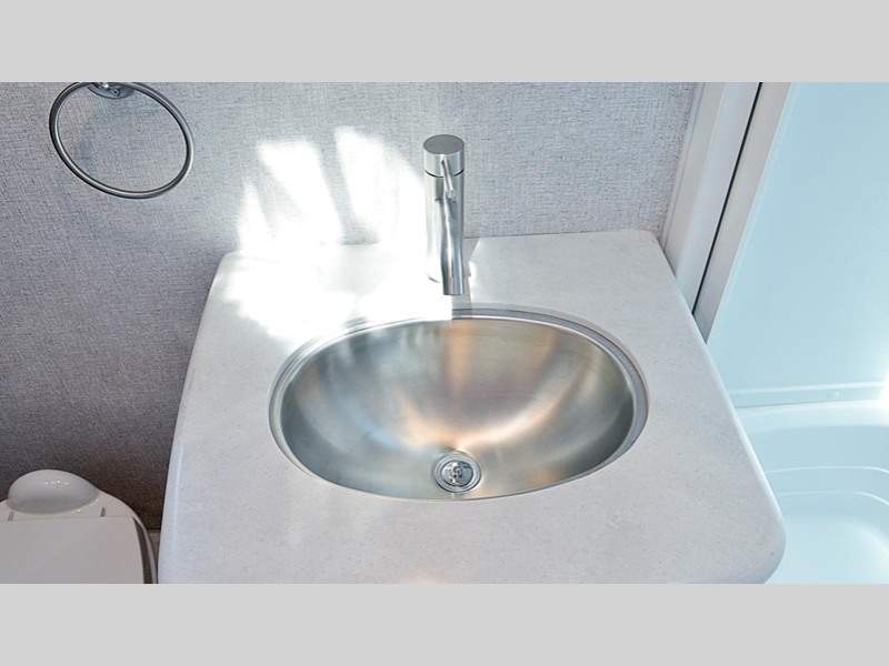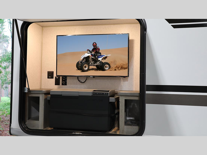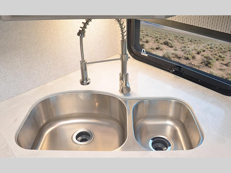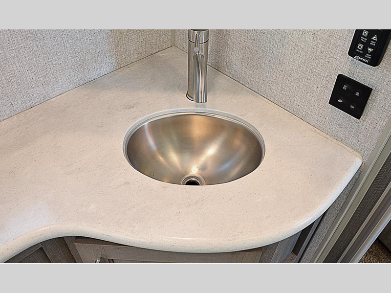A leveling system will make setting up camp easier than ever, and SolX solar panels will provide off-grid power. Inside, you'll love custom one-piece formed countertops, solid surface kitchen and bath countertops, slow rise night shades, and many more comforts. The exterior is just as convenient with its slam latch luggage doors, outside speakers, heating holding tanks and more!