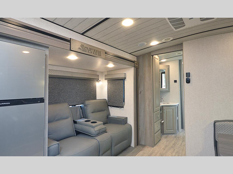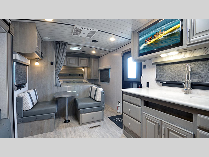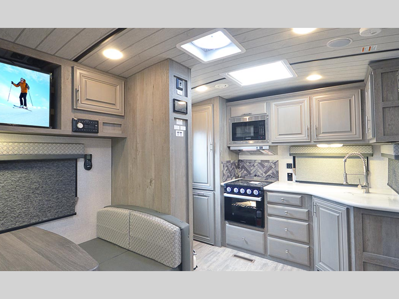 Sleeps 3 Slides 2 Length 29 ft 9 in Ext Width 8 ft 6 in Ext Height 11 ft 4 in Interior Color Moonstone, Carbon Hitch Weight 1065 lbs GVWR 12800 lbs Dry Weight 8385 lbs Cargo Capacity 4415 lbs Fresh Water Capacity 100 gals Grey Water Capacity 90 gals Black Water Capacity 55 gals Tire Size 16" Furnace BTU 30000 btu Available Beds King Refrigerator Type 12V Refrigerator Size 10 cu ft Cooktop Burners 3 Number of Awnings 1 Axle Weight 7320 lbs LP Tank Capacity 80 lbs Water Heater Capacity 10 gal Water Heater Type DSI Gas/Electric Quick Recovery AC BTU 13500 btu TV Info LR 32" 12V LED TV Awning Info LED w/Adjustable Pitch and FLXguard Axle Count 2 Shower Type Standard Solar Wattage 1000 watts Similar Floorplans