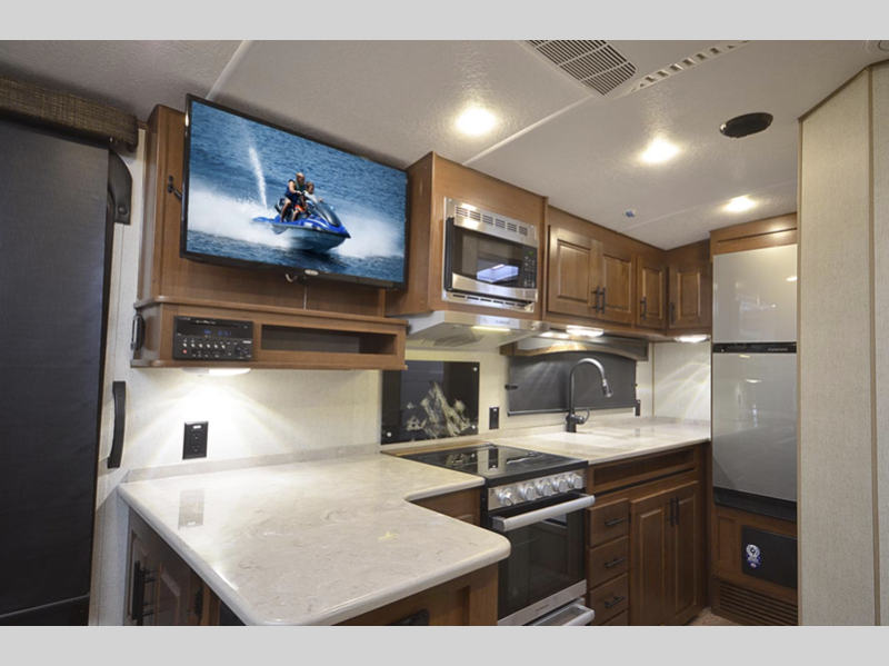 Each model features a Lamilux HD 4000 high gloss silver fiberglass, sleek design frameless thermal pane windows, and chrome door locks for that added touch of luxury. You will love the LG solid surface countertops, mountain lodge interiors with hardwood throughout, and privacy blackout roller shades.